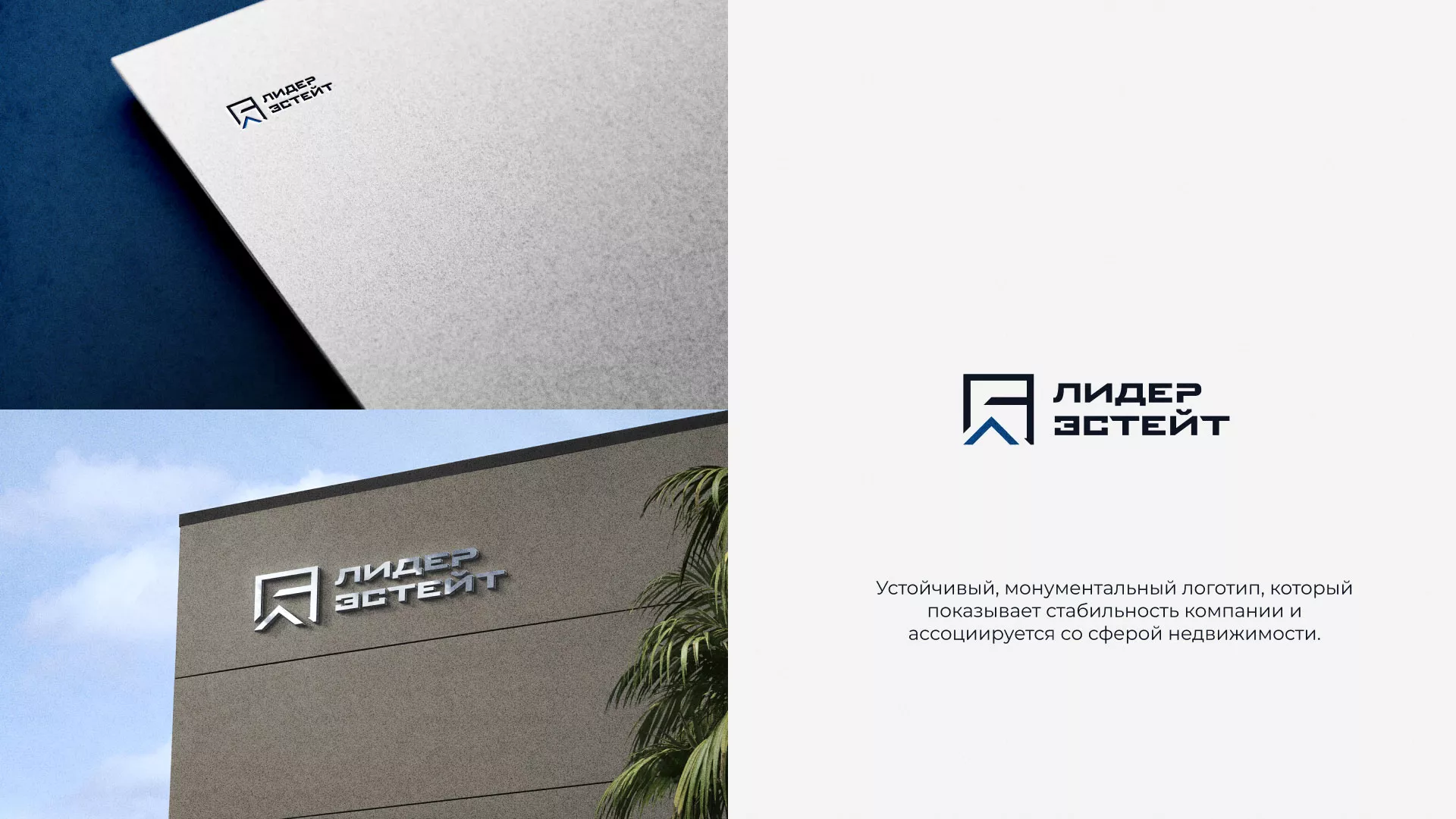 Разработка логотипа в Поворино для агентства недвижимости «Лидер Эстейт». Устойчивый, монументальный логотип, который показывает стабильность компании и ассоциируется со сферой недвижимости.